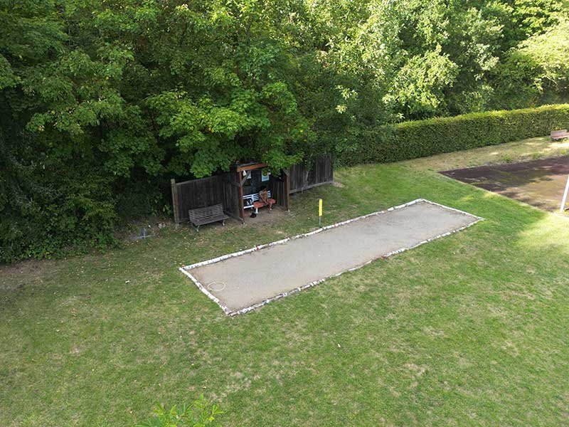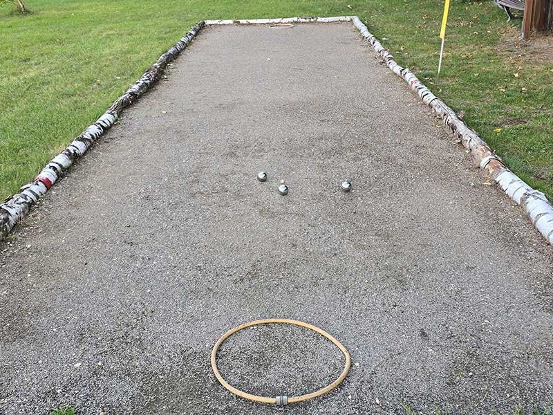 Die Bahn liegt sonnig, ist 12 Meter lang und 4 Meter breit und wird regelmäßig gewartet. Umrahmt wird sie von Birkenstämmen aus unserem eigenen Wäldchen. Und auch Zuschauer kommen auf ihre Kosten: Eine gemütliche Sitzbank lädt zum Mitfiebern und Anfeuern ein.
